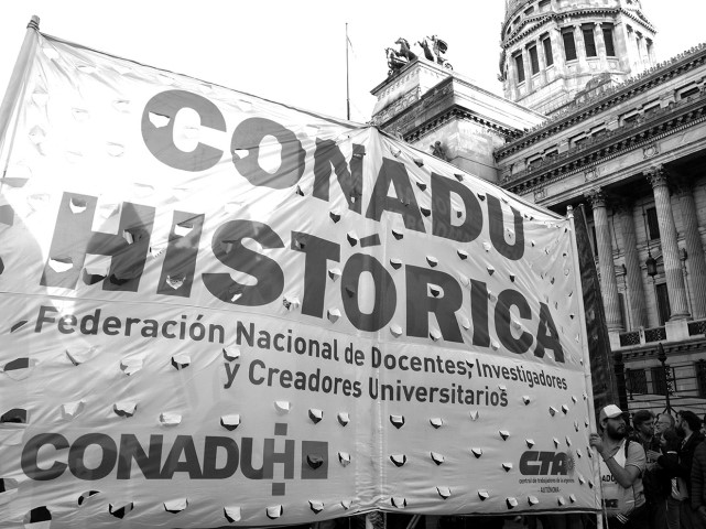 Miembros de la Mesa Ejecutiva Nacional de CONADU Histórica informaron este lunes 1 en conferencia de prensa que la Federación presentó una acción de amparo sindical que pide medidas cautelares urgentes para la vigencia de la Ley de Financiamiento de las Universidades.