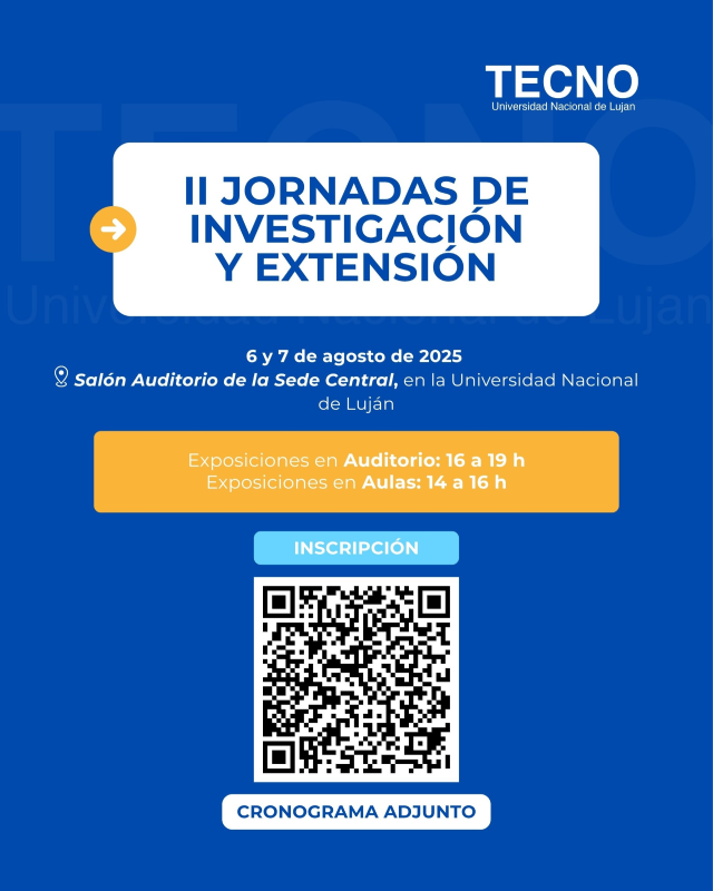 Las II Jornadas de Investigación y Extensión del Departamento de Tecnología se realizarán los próximos miércoles 6 y jueves 7 de agosto, con actividades expositivas que mostrarán a la comunidad los trabajos desarrollados en las diferentes disciplinas que abarca esta unidad académica de la UNLu, como producción y sanidad vegetal, nutrición, y alimentos y bioquímica. El acto de apertura se desarrollará el mismo miércoles 6 desde las 16 horas en el Salón Auditorio “Dardo Dorronzoro” de la Sede Central, con la participación del rector Walter Panessi, la directora decana del Departamento de Tecnología, Elena Craig, la vicedirectora decana Jimena Mazieres, y el presidente de la Comisión de Investigaciones Científicas (CIC) de la Provincia de Buenos Aires, Roberto Salvarezza, junto a otras autoridades.