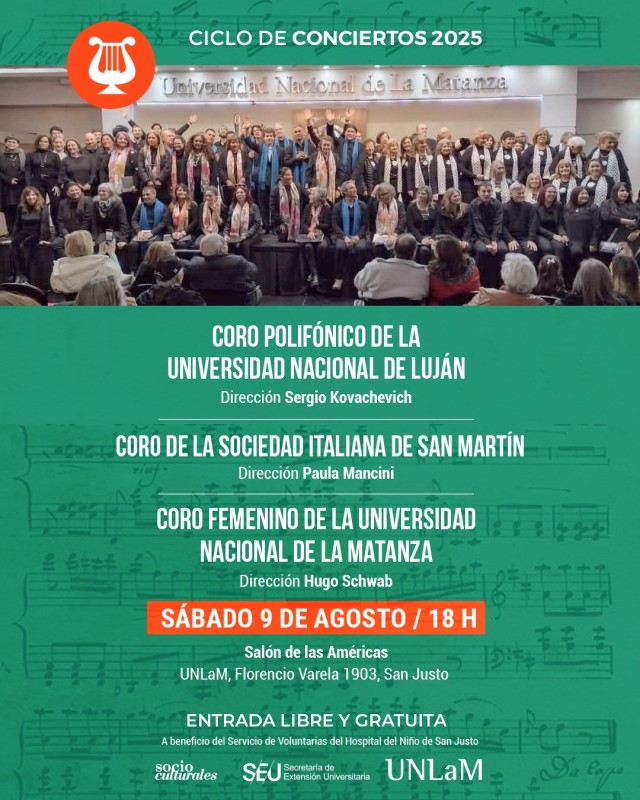 El Coro Polifónico de la Universidad Nacional de Luján se presentará en los "Encuentros Corales UNLam 2025", este sábado 9 de agosto desde las 18 horas, en la sede central de la Universidad de La Matanza.Bajo la dirección de Sergio Kovachevich, el Coro de la UNLu actuará en el Salón de las Américas de la UNLam (Florencia Varela 1903, La Matanza) junto al Coro de la Sociedad Italiana de San Martín (dirigido por Paula Mancini) y el Coro Femenino de la UNLaM (dirigido por Hugo Schwab).