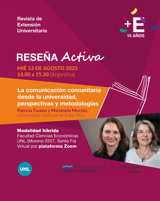 El miércoles 13 de agosto, de 14 a 15.30 horas (Arg.) en modalidad híbrida, se realizará el conversatorio 15 años de +E! Segundo encuentro de Reseña Activa "Comunicación comunitaria desde la universidad, perspectivas y metodologías".