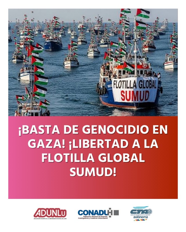Desde ADUNLu levantamos nuestras voces en solidaridad con el pueblo palestino y con los militantes de la Flotilla que arriesgan sus vidas para romper el cerco y llevar ayuda humanitaria.