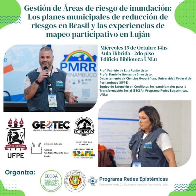 Este miércoles 15 de octubre desde las 14 horas, se realizará la charla "Gestión de Áreas de Riesgo de Inundación: los Planes Municipales de Reducción de Riesgos en Brasil y las experiencias de mapeo participativo en Luján", organizada por el Equipo de Extensión en Conflictos Socioambientales para la Transformación Social (EECSA).Este equipo extensionista funciona en el Programa de Investigación Redes Epistémicas del Departamento de Ciencias Sociales de la UNLu, y el encuentro tendrá lugar en el aula híbrida del Edificio Biblioteca - 2º piso de la UNLu.