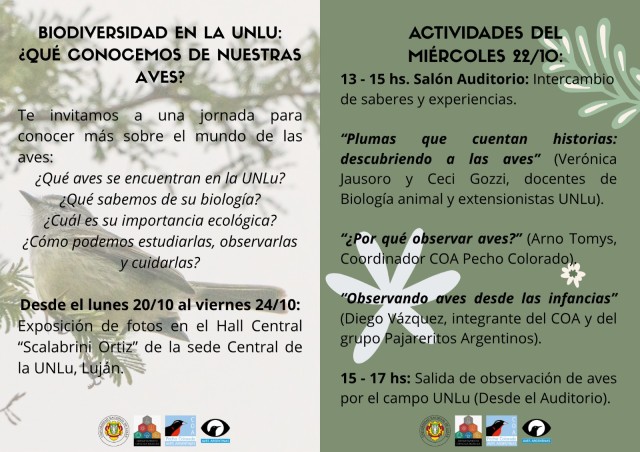 Además, el miércoles 22 desde las 13 horas en el Auditorio se desarrollará una jornada de intercambio de experiencias y saberes donde participarán docentes de la UNLu e integrantes del COA Pecho Colorado de Luján y del Grupo Pajareritos Argentinos.