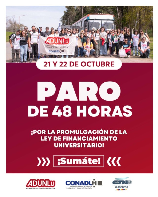 El Plenario de Secretarías Generales de CONADU Histórica resolvió convocar a un nuevo paro docente de 48 horas los próximos martes 21 y miércoles 22 de octubre, en reclamo de la aplicación plena y efectiva de la Ley de Financiamiento Universitario, sancionada y confirmada por el Congreso Nacional.