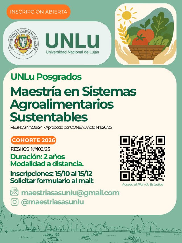 Entre el 15 de octubre y el 15 de diciembre de 2025, con un período adicional del 9 de febrero al 6 de marzo de 2026 estará abierta la inscripción a la Maestría en Sistemas Agroalimentarios Sustentables, que se cursará a distancia entre el 16 de marzo de 2026 y diciembre de 2027.