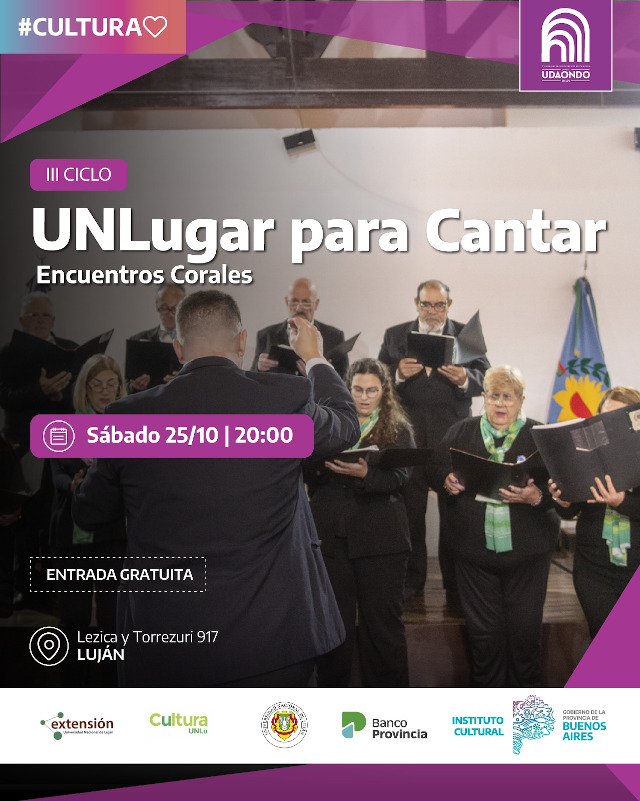 Este sábado 25 de octubre, desde las 20 horas en el Complejo Museográfico Provincial “Enrique Udaondo”, se realizará el III Ciclo de Encuentros Corales "UNLugar para Cantar", con la participación del Coro Polifónico UNLu, Vocal Enarmonia y del Ensamble Vocal Femenino UNLu.
