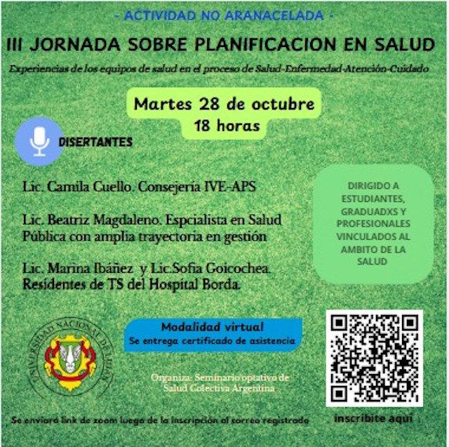 El martes 28 de octubre, a las 18 horas mediante la plataforma Zoom, se realizará la Tercera Jornada sobre Planificación e interdisciplina en Salud: “Experiencias de los equipos de salud en el proceso de Salud-Enfermedad-Atención-Cuidado”.