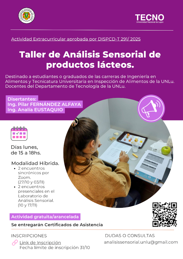 Desde ayer lunes 27 de octubre y continuando los próximo lunes 3, 10 y 17 de noviembre, de 15 a 18 horas de manera semipresencial en la Sede Central de la Universidad Nacional de Luján, se realiza la Actividad Extracurricular “Taller de Análisis Sensorial de productos lácteos”.