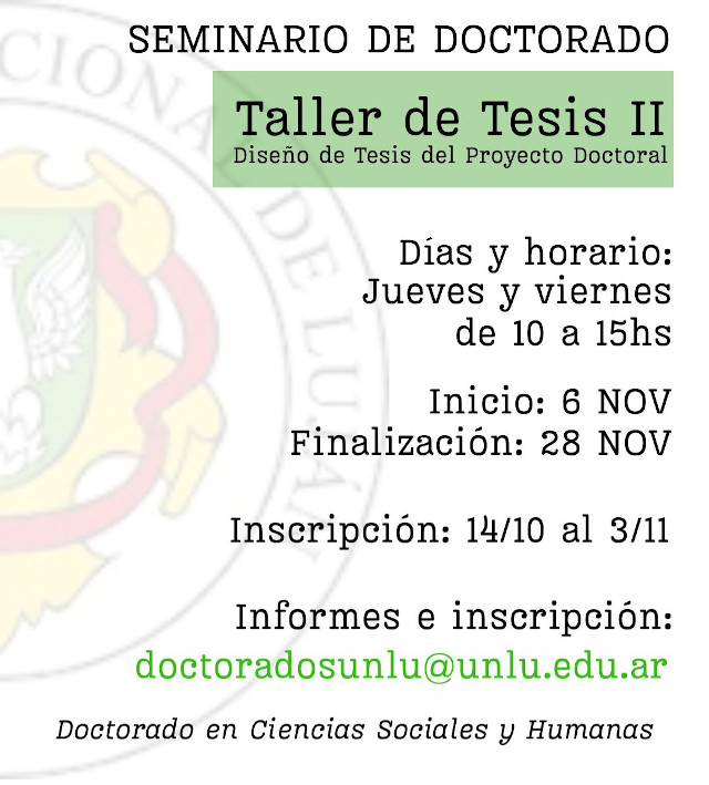 El Taller tendrá inicio el 6 de noviembre y finalizará el día 28 de ese mes. Se dictará los jueves y viernes de 10 a 15 horas. Consultas y Preinscripción: doctoradosunlu@unlu.edu.ar