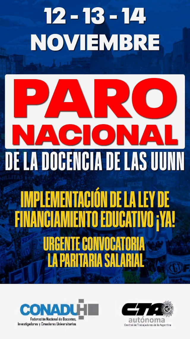 Paro Nacional de CONADU Histórica los días 12, 13 y 14 de noviembre