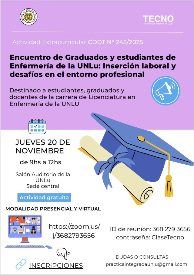 El próximo jueves 20 de noviembre se va a desarrollar un encuentro de graduados, docentes y estudiantes de enfermería en la Sede Central de la Universidad Nacional de Luján, bajo la consigna “inserción laboral y desafíos en el entorno profesional".Se trata de la actividad extracurricular que se realizará de 9 a 12 horas en el Salón Auditorio “Dardo Dorronzoro”, con entrada libre y gratuita, y que también podrá seguirse virtualmente, por la aplicación sincrónica Zoom.