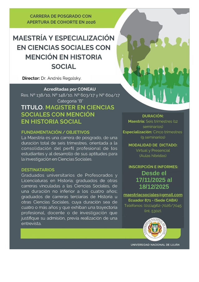 Hasta el 18 de diciembre está abierta la inscripción para la cohorte 2026 de las Carreras de Posgrado Maestría y Especialización en Ciencias Sociales con Mención en Historia Social, de la Universidad Nacional de Luján.