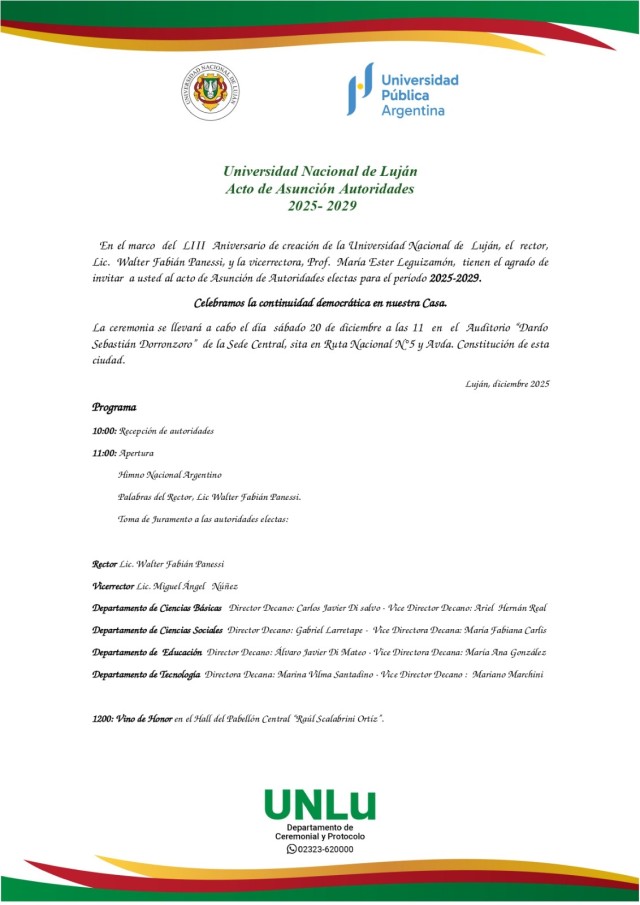 Desde el Rectorado de la UNLu, a través de la Dirección de Gestión y del Departamento de Ceremonial y Protocolo, invitan a toda la comunidad a participar del evento, en el que estarán presentes integrantes de todos los claustros, junto a familiares y allegados.