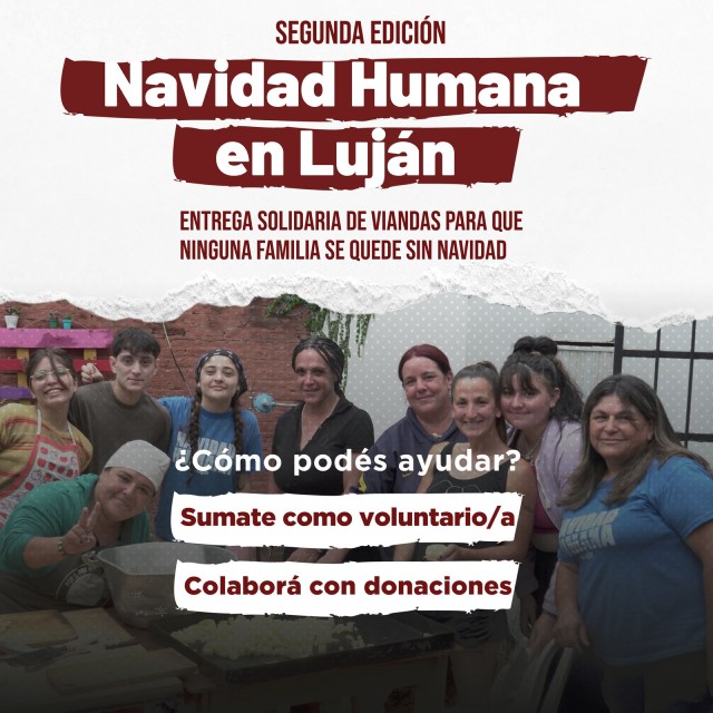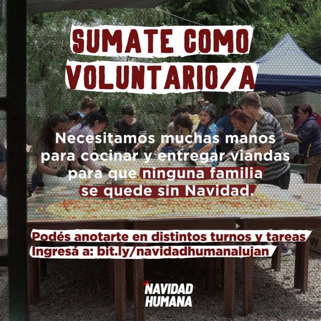 “Necesitamos muchas manos para cocinar y entregar viandas para que ninguna familia se quede sin Navidad”, señalan las y los organizadores, que aclararon que cualquier persona que lo desee puede anotarse “en distintos turnos y tareas” para colaborar desinteresadamente, ingresando a bit.ly/navidadhumanalujan