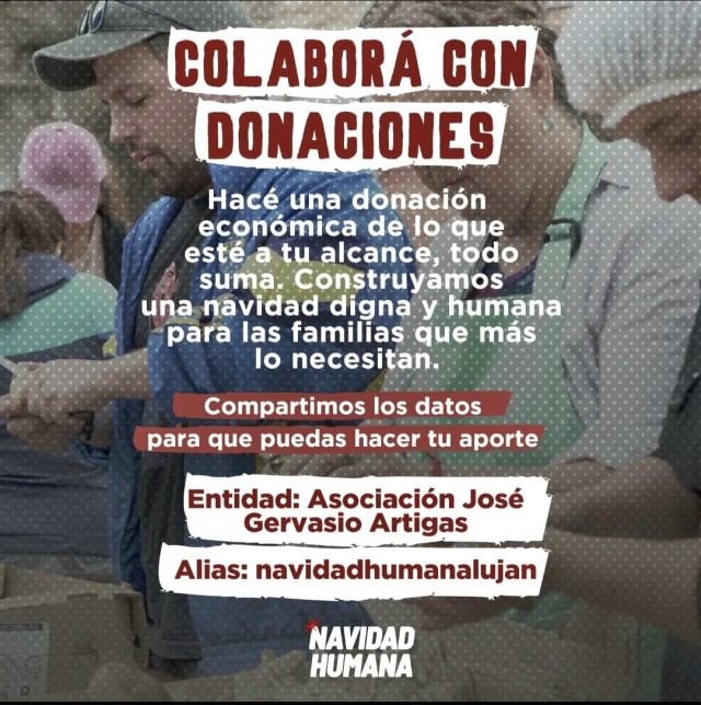 La Asociación Civil José Gervasio Artigas organiza este año su segunda edición de “Navidad Humana en Luján”, actividad solidaria de entrega de viandas, que tiene el propósito de colaborar “para que ninguna familia se quede sin Navidad”.La convocatoria es abierta a toda la comunidad, y abarca distintas posibilidades de colaboración: se puede hacer un aporte económico, acercar alimentos, o se puede ayudar en las distintas tareas de la confección de las viandas y su distribución.