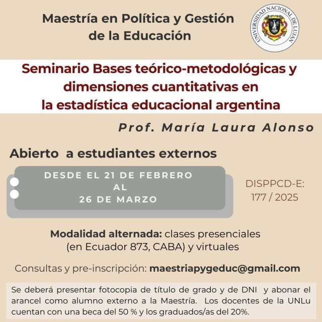 Desde el 21 de febrero al 26 de marzo se dictará el seminario “Bases teórico-metodológicas y dimensiones cuantitativas en la estadística educacional argentina”, en el marco de la Maestría en Política y Gestión de la Educación de la Universidad Nacional de Luján.