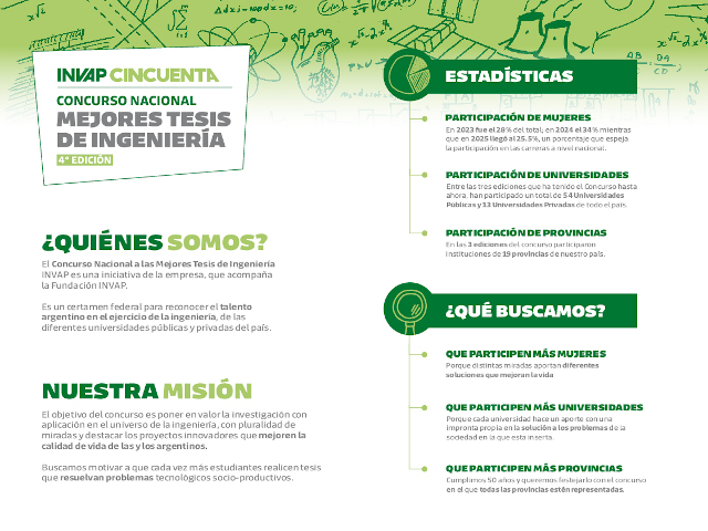 La empresa INVAP inició una nueva convocatoria del Concurso nacional a las mejores tesis de Ingeniería, con el objetivo de “poner en valor la investigación con aplicación en el universo de la ingeniería con pluralidad de miradas y destacar los proyectos innovadores que mejoren la calidad de vida de las y los argentinos”.