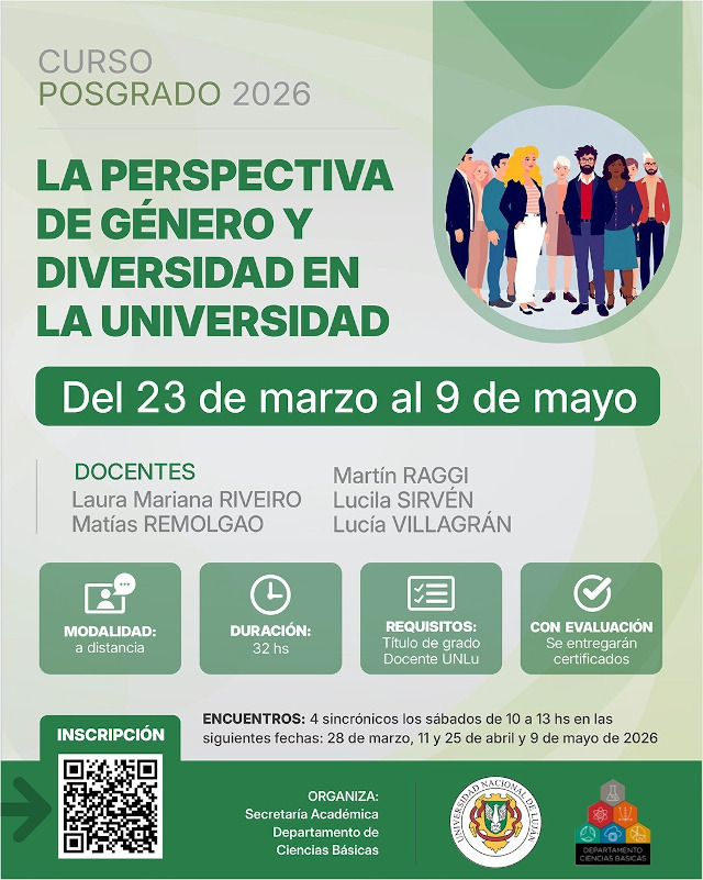 Del 23 de marzo al 9 de mayo se desarrollará, con modalidad a distancia, el curso de posgrado “La perspectiva de género y diversidad en la Universidad”, organizado por la Secretaría Académica del Departamento de Ciencias Básicas de la Universidad Nacional de Luján (UNLu).
