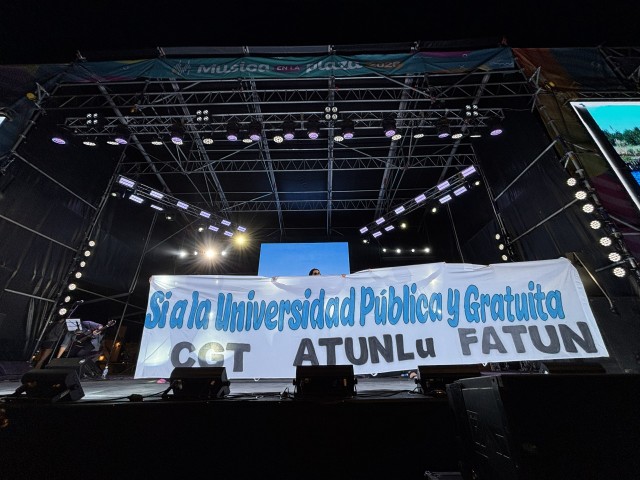 Mientras trabajadoras y trabajadores de la UNLu realizaban una intensa volanteada informativa entre el público presente, otras compañeras y compañeros fueron invitados a subir al escenario del multitudinario encuentro artístico. Allí, mostraron una gran bandera con la inscripción "Sí a la Universidad Pública y Gratuita".