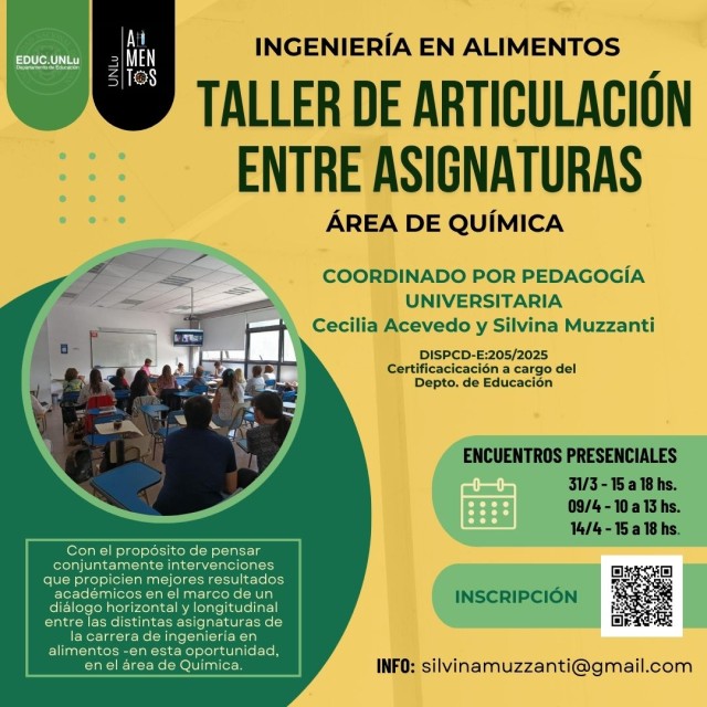 Con tres encuentros presenciales se realiza en este mes de marzo un taller de articulación entre asignaturas del área de Química que forman parte de la Carrera de Ingeniería en Alimentos de la UNLu, y que continuará en abril con otras dos jornadas agregadas: el jueves 9, de 10 a 13 horas, y el martes 14, de 15 a 18 horas.
