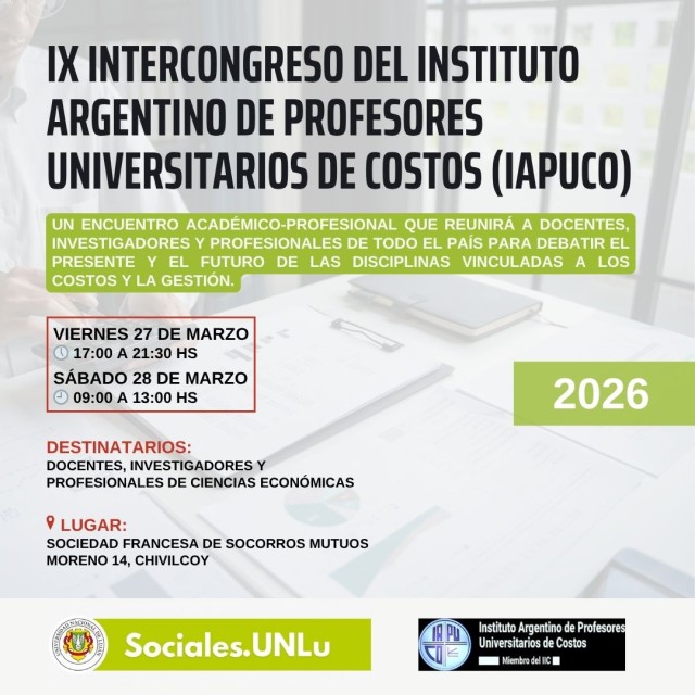 Este viernes 27 y sábado 28 de marzo se realizará en la Sociedad Francesa de Socorros Mutuos de la ciudad de Chivilcoy el IX Intercongreso del Instituto Argentino de Profesores Universitarios de Costos (IAPUCO), un encuentro académico-profesional que reunirá a docentes, investigadores y profesionales de todo el país, con la participación de docentes de la UNLu.Este encuentro servirá “para debatir el presente y el futuro de las disciplinas vinculadas a los costos y la gestión”, y en su organización participan docentes del área de costos de la División Información Contable del Departamento de Ciencias Sociales UNLu.