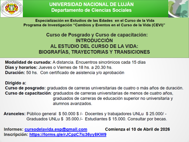 El viernes 10 de abril comenzará a dictarse el Curso de Posgrado y Curso de Capacitación "Introducción al estudio del curso de la vida: biografías, trayectorias y transiciones", organizado por la carrera de Especialización en Estudios de las Edades en el Curso de la Vida de la Universidad Nacional de Luján y el Programa de Investigación, Extensión y Transferencia "Cambios y Eventos en el Curso de la Vida" (CEVI), del Departamento de Ciencias Sociales.