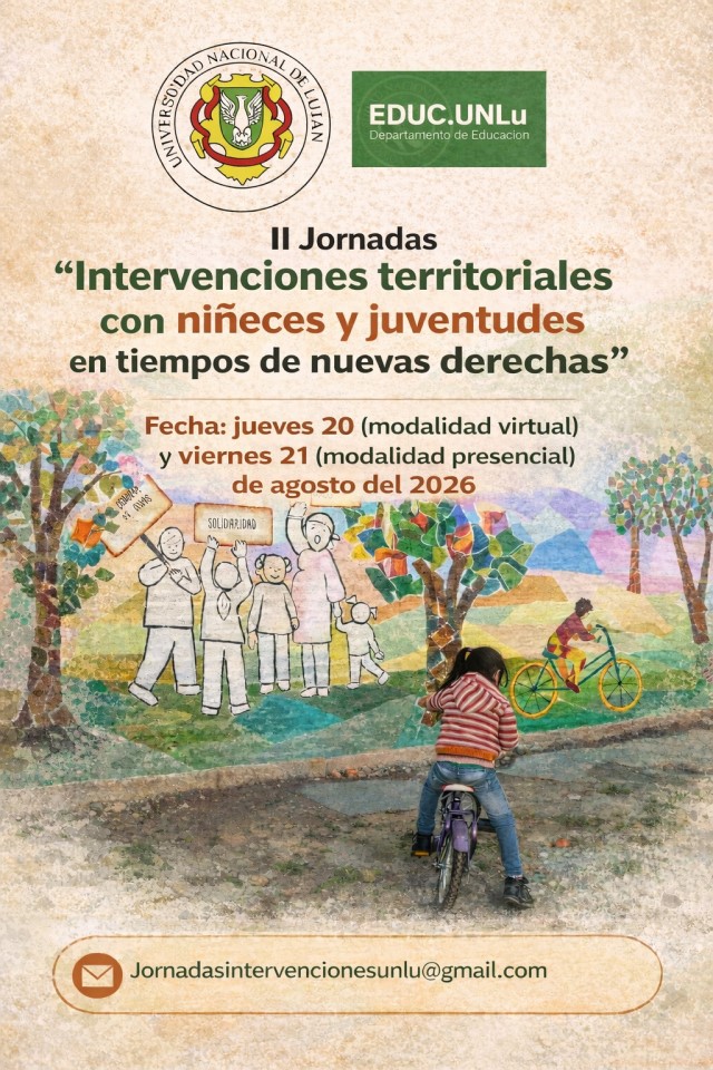 El Departamento de Educación de la Universidad Nacional de Luján difundió la segunda circular de las II Jornadas “Intervenciones territoriales con niñeces y juventudes en tiempos de nuevas derechas”, que se realizarán el 20 de agosto en modalidad virtual y el 21 de agosto de forma presencial en la Sede Central.