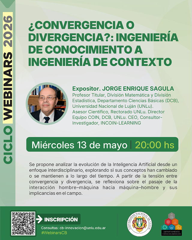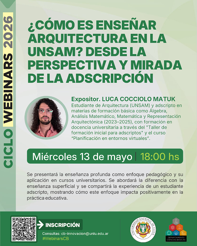 El Departamento de Ciencias Básicas de la Universidad Nacional de Luján informó que ya se encuentra abierta la inscripción a la primera tanda de Webinars del Ciclo 2026, que se desarrollará el día miércoles 13 de mayo a partir de las 18 horas.