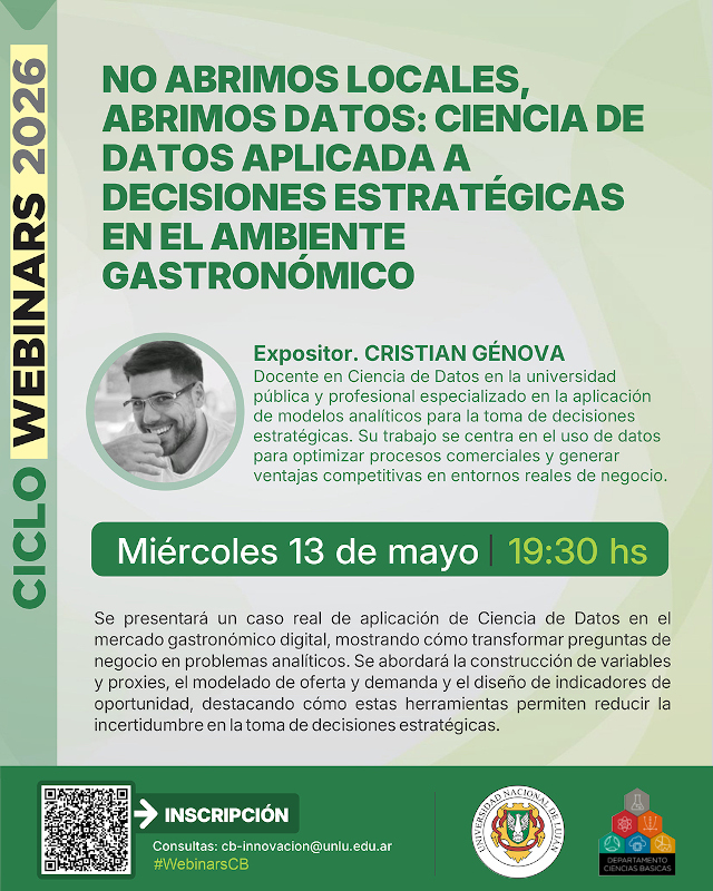 19:30 hs: "No abrimos locales, abrimos datos: Ciencia de Datos aplicada a decisiones estratégicas en el ambiente gastronómico". Expositor: Cristian Génova.