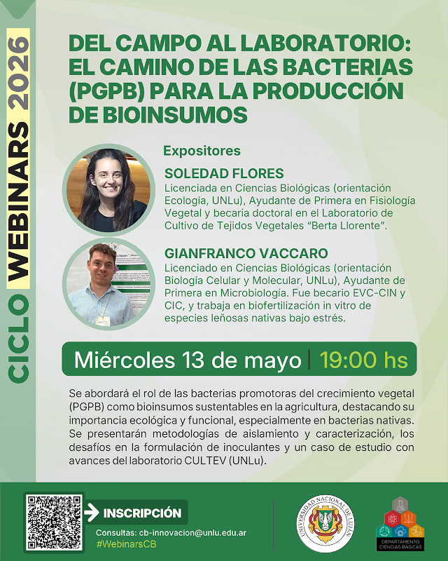 19:00 hs: "Del campo al laboratorio: el camino de las bacterias (PGPB) para la producción de bioinsumos". Expositores: Soledad Flores, Gianfranco Vaccaro.