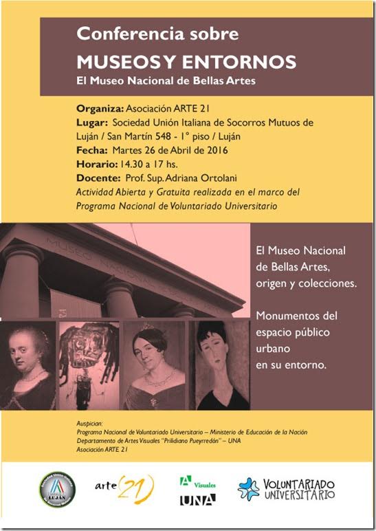 El martes 26 de abril a partir de las 14.30 la Asociación Arte 21 organiza una Conferencia abierta y gratuita sobre Museos y Entornos denominada: El Museo Nacional de Bellas Artes: Origen y colecciones. Monumentos del espacio público urbano en su entorno.