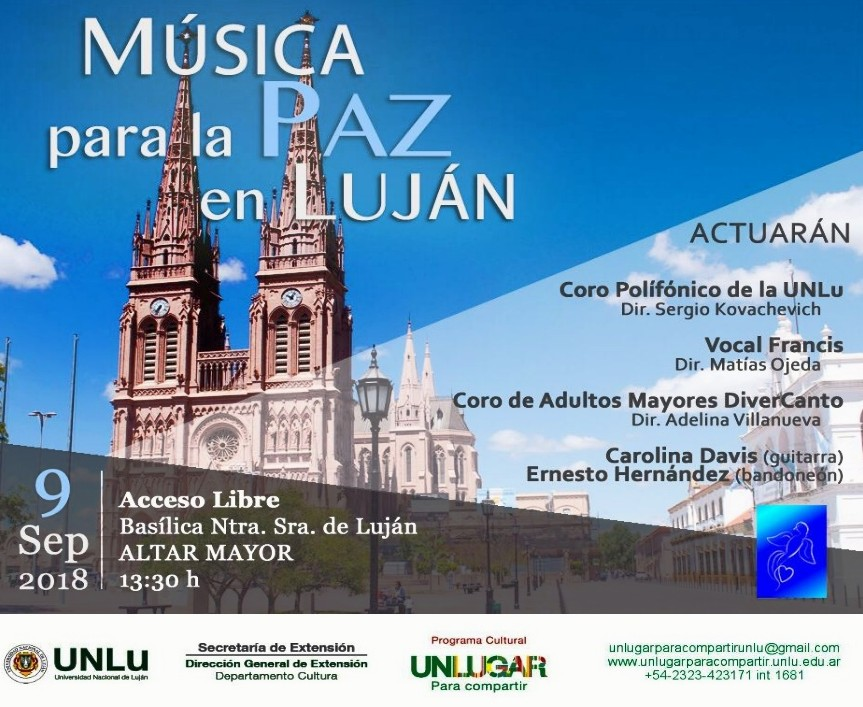 El Departamento de Cultura, dependiente de la Dirección General de Extensión, informó que el domingo 9 de septiembre, desde las 13.30 en la Basílica de Luján, se realizará el concierto “Música para la paz”, con entrada libre.