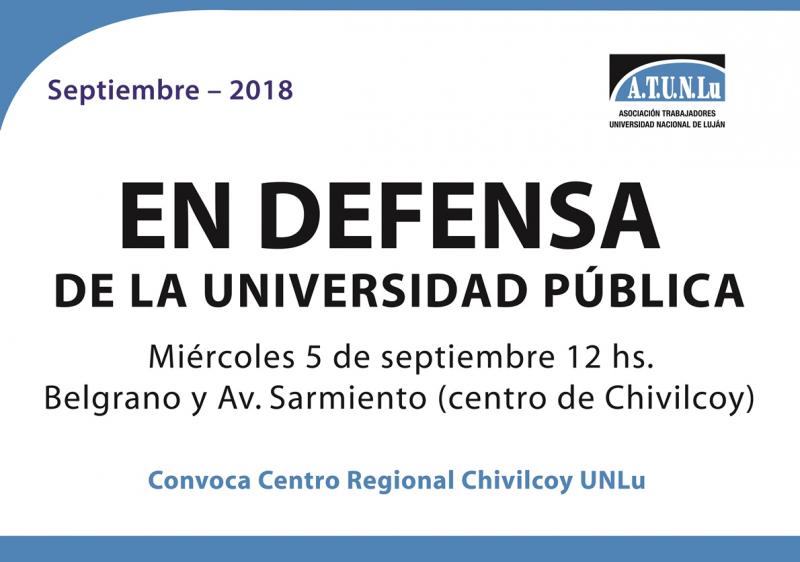 "En Defensa de la Universidad Pública", la Asociación de Trabajadores de la Universidad de Luján (ATUNLu) informó que este próximo miércoles 5 de septiembre convoca a los trabajadores nodocentes, y a todos los miembros de la comunidad universitaria, a concentrar en el centro de la ciudad de Chivilcoy, como una forma de seguir visibilizando la compleja situación universitaria.